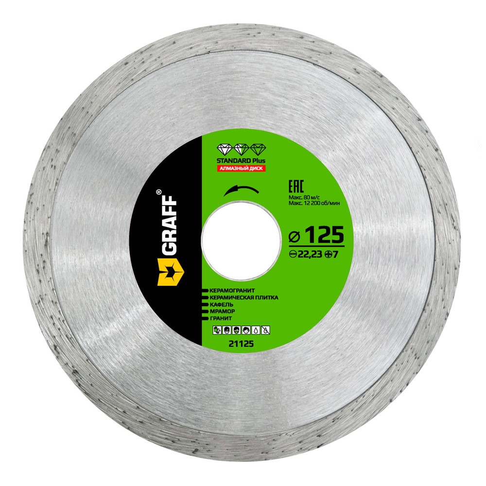Алмазный диск по керамической плитке диаметром 125 мм GRAFF для болгарки (УШМ). Диск изготовлен методом термической опрессовки и предназначен для резки настенной и напольной керамической плитки, искусственного камня, тротуарной плитки.