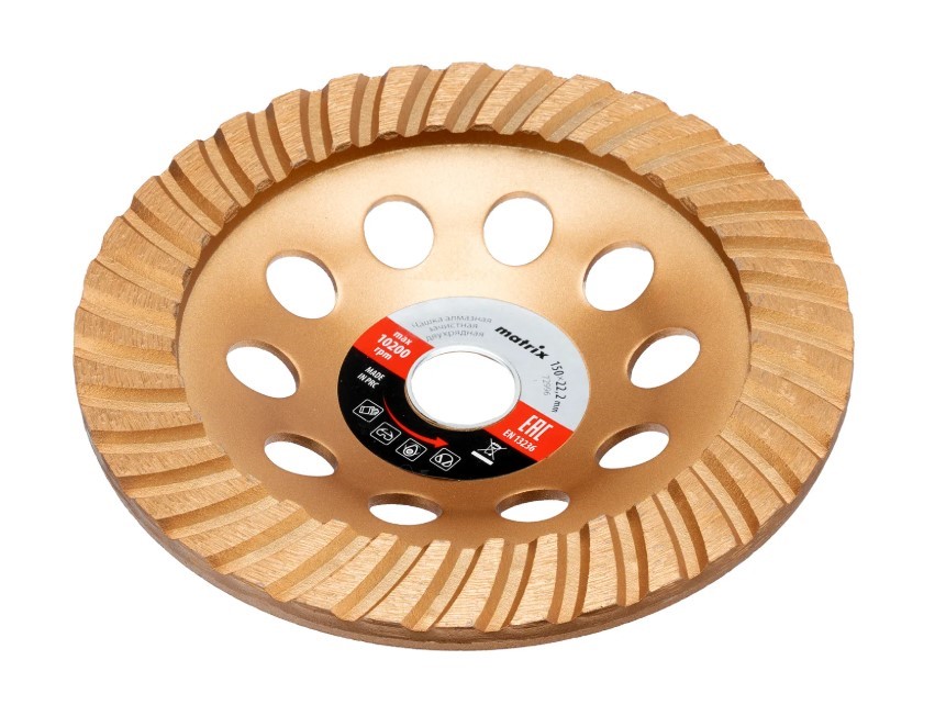 Алмазная зачистная чашка 150 мм Matrix Turbo предназначена для профессионального применения с использованием вал углошлифовальной машины (болгарки). Используется для придания окончательной гладкости бетонным, каменным, мраморным, гранитным и кирпичным поверхностям, а также для снятия фаски на плитах из гранита или мрамора. .