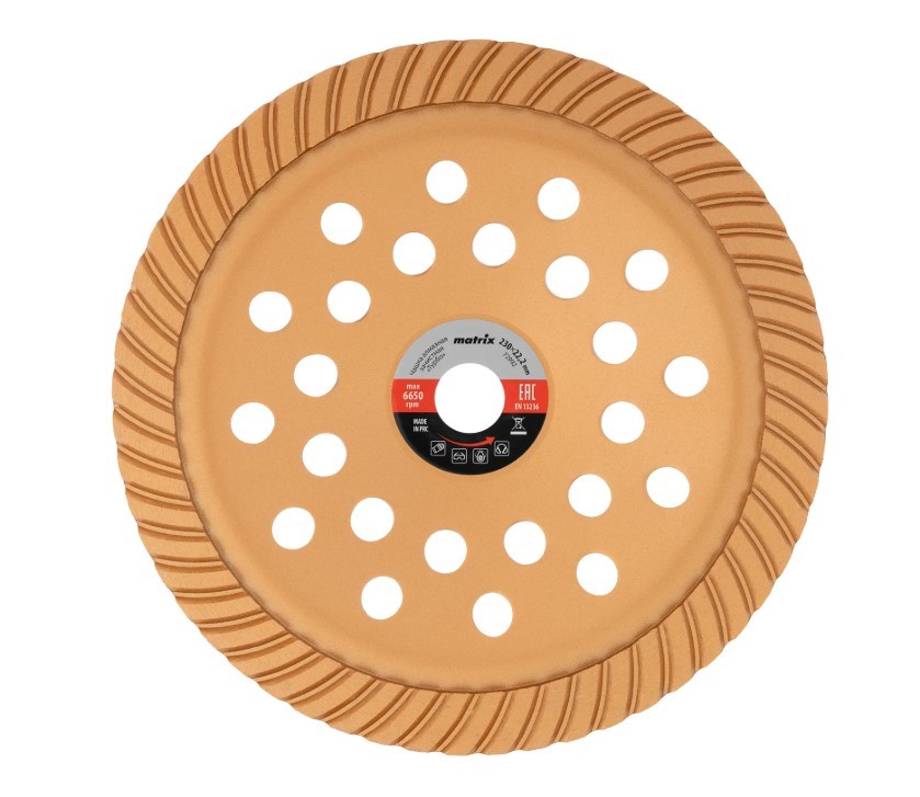 Алмазная зачистная чашка230 мм Matrix Turbo предназначена для профессионального применения с использованием вал углошлифовальной машины (болгарки). Используется для придания окончательной гладкости бетонным, каменным, мраморным, гранитным и кирпичным поверхностям, а также для снятия фаски на плитах из гранита или мрамора. .