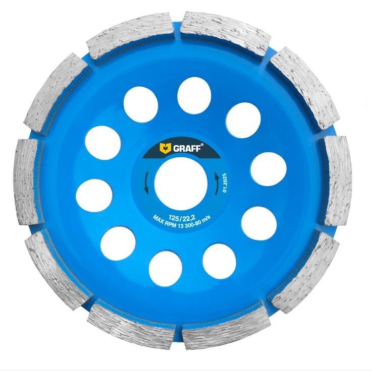 Чашка алмазная по бетону однорядная GRAFF – это профессиональный инструмент примененяющийся в строительной и ремонтной сфере. Ряд алмазных сегментов позволяет эффективно удалять неровности и дефекты с поверхности бетона. Высокая прочность и долговечность алмазных сегментов гарантируют длительный срок службы чашки.