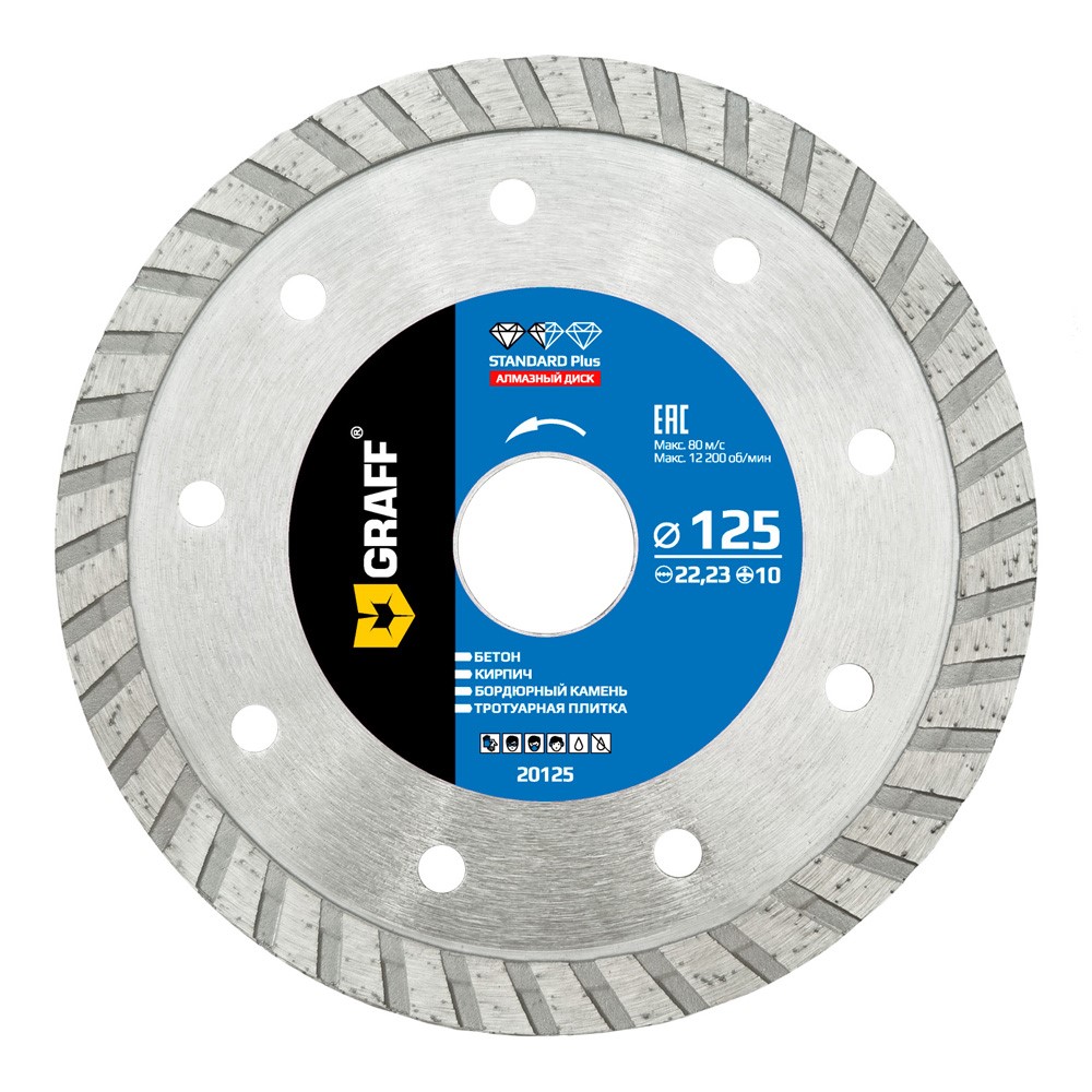 Турбо отрезной алмазный диск с увеличенным сегментом по бетону и камню диаметром 125 мм GRAFF для болгарки (УШМ). Увеличенный режущий сегмент до 10 мм увеличивает рабочий ресурс диска до 25 процентов, по сравнению с аналогами где стандартная высота алмазного сегмента 7 мм.