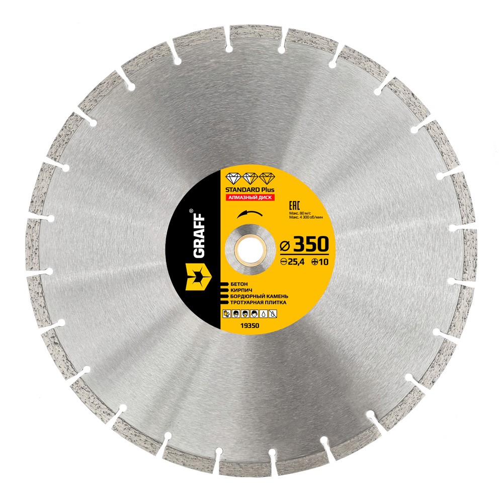 Алмазный отрезной диск с увеличенным сегментом по бетону и камню диаметром 350 мм GRAFF изготовлен методом термической опрессовки и предназначен для резки не армированного бетона, искусственного камня, тротуарной плитки, бордюрного камня. Одинаково эффективен как при сухой так и при резки с охлаждающей жидкостью.