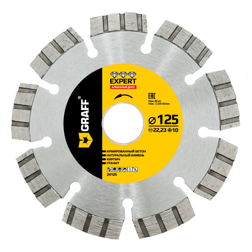 Профессиональный алмазный отрезной диск 125x10x2,2x22,23 мм по армированному бетону и камню GRAFF серия "Expert".