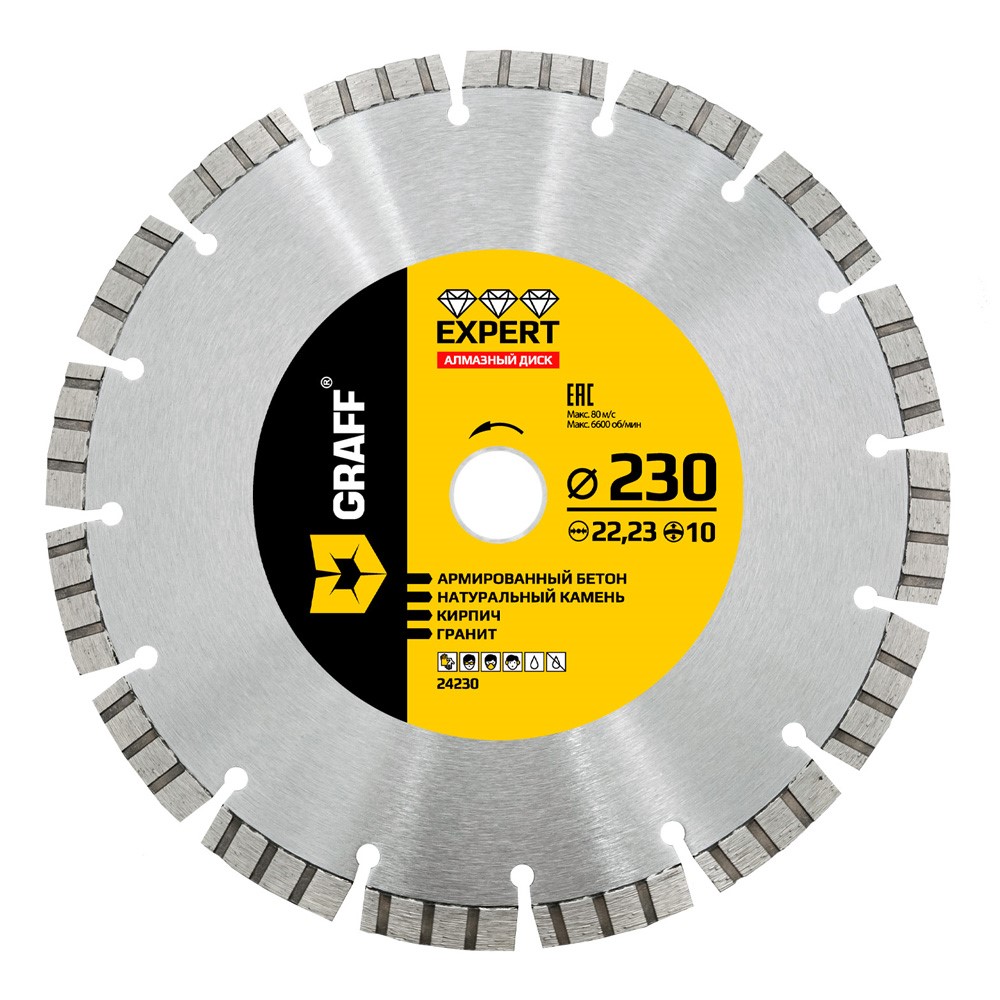 Профессиональный алмазный отрезной диск 230x10x2,6x22,23 мм по армированному бетону и камню GRAFF серия "Expert".