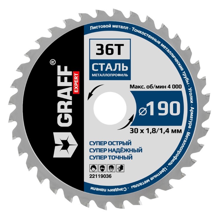 Диск пильный по стали и металлопрофилю 190х30х1,8/1,4 мм 36 зуб. GRAFF Expert