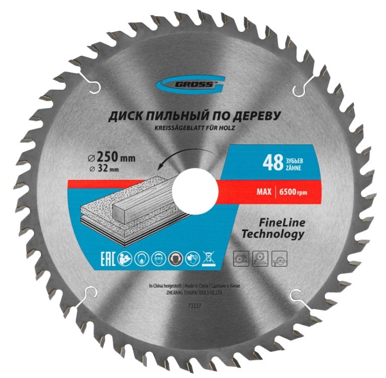 - Пильный диск Gross 73337, ф250 х 32 мм, с 48 зубьями и переходным кольцом 32/30 мм предназначен для распила древесины мягких и твердых пород, ДСП, МДФ и фанеры.