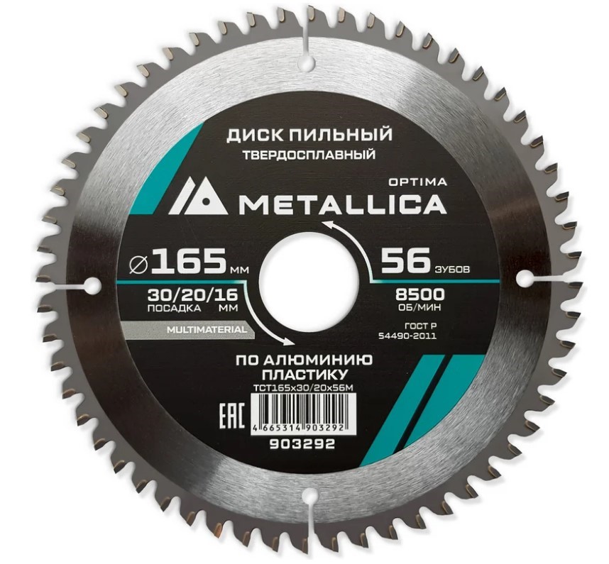 Диск пильный по алюминию 165×30/20/16x56Z 2.4 мм METALLICA Optima