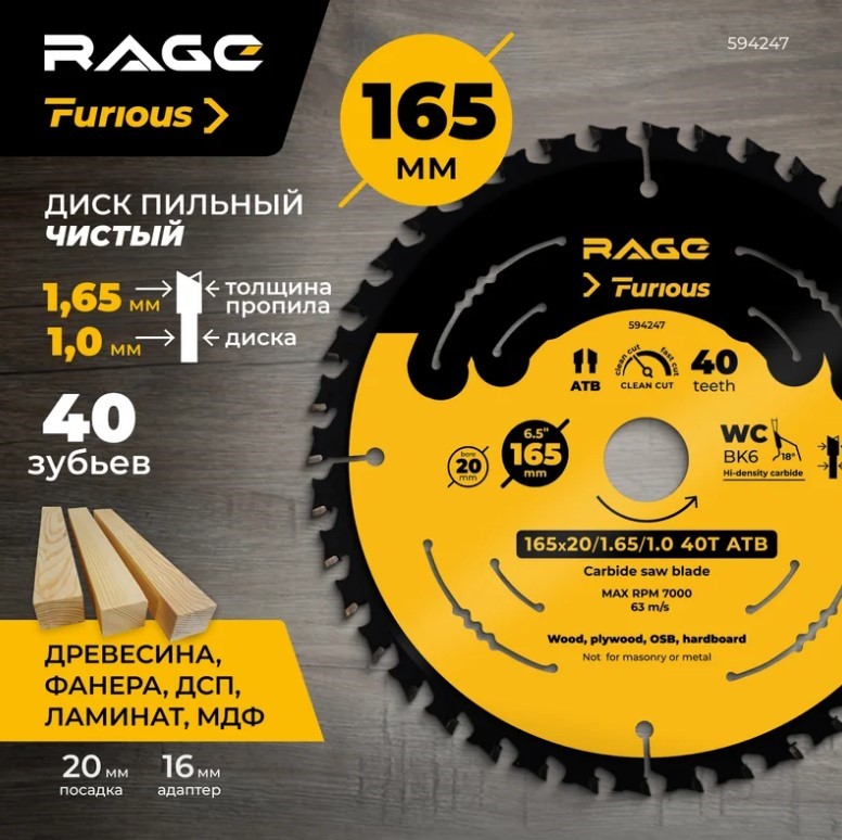 Диск пильный по дереву 165х20/16 40 зуб RAGE Furious
