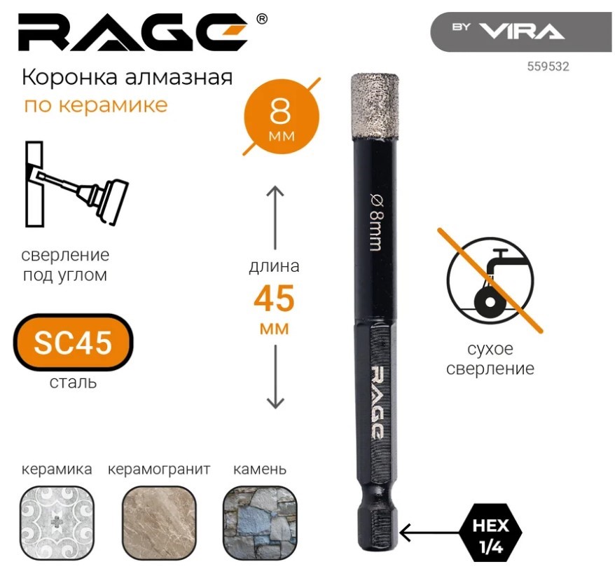 Коронка алмазная по керамограниту 8 мм с шестигранным хвостовиком rage by VIRA