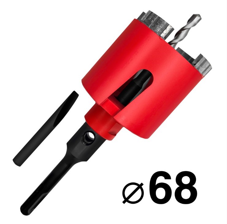 | Назначение | Данный тип коронок применяется только в безударном режиме сверления. Для облегчения работы и во избежание заклинивания коронки необходимо использовать легкие вращательные движения (перфоратором) во время работы, а также следует извлечь центрирующее сверло после прохождения первых 5 мм обрабатываемого материала. |