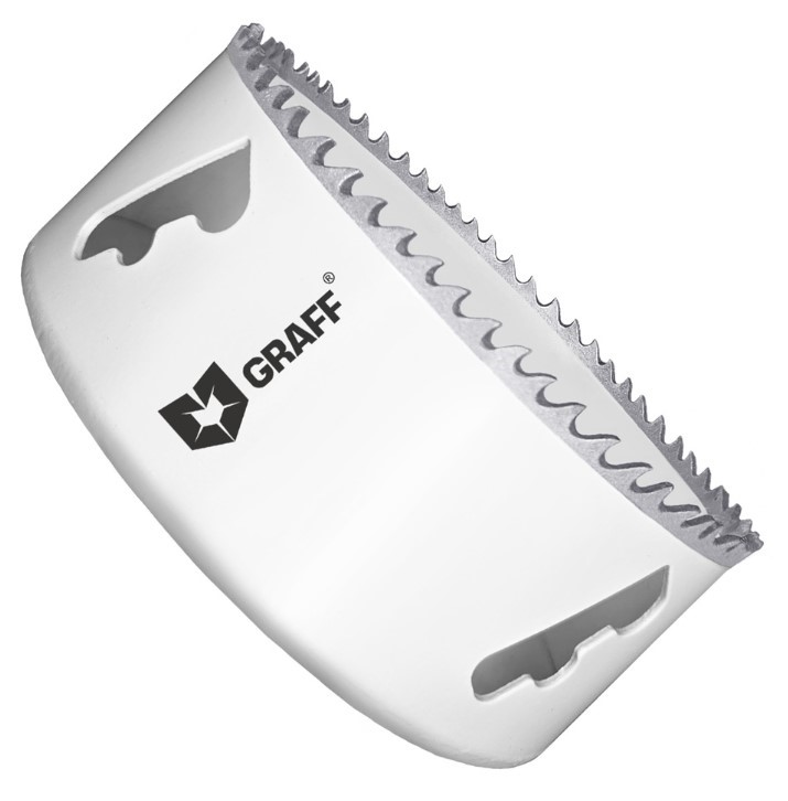 Биметаллическая коронка GRAFF изготовлена из из быстрорежущей стали с содержанием кобальта 8% в режущей кромке, такой сплав обеспечивает высокую износостойкость и эффективную работу. Специальная конфигурация и развод зубьев обеспечивают быстрое удаление стружки и более чистый рез.