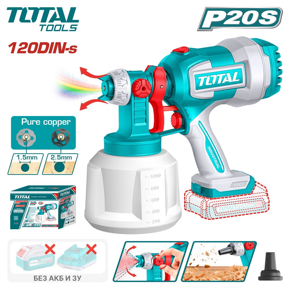 Краскораспылитель аккумуляторный 1000 мл, 120 DIN, 20В, без АКБ TOTAL