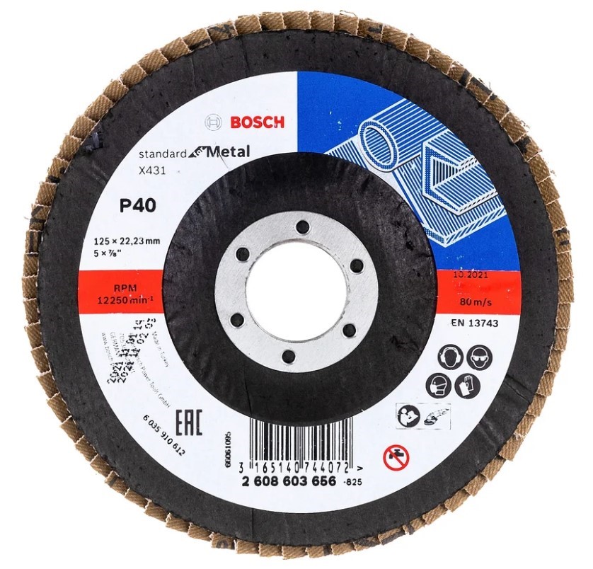 Лепестковый шлифкруг X431 BOSCH Standard for Metal 125 мм К 40, угловое исполнение - EN 13743 применяется для обработки металла.