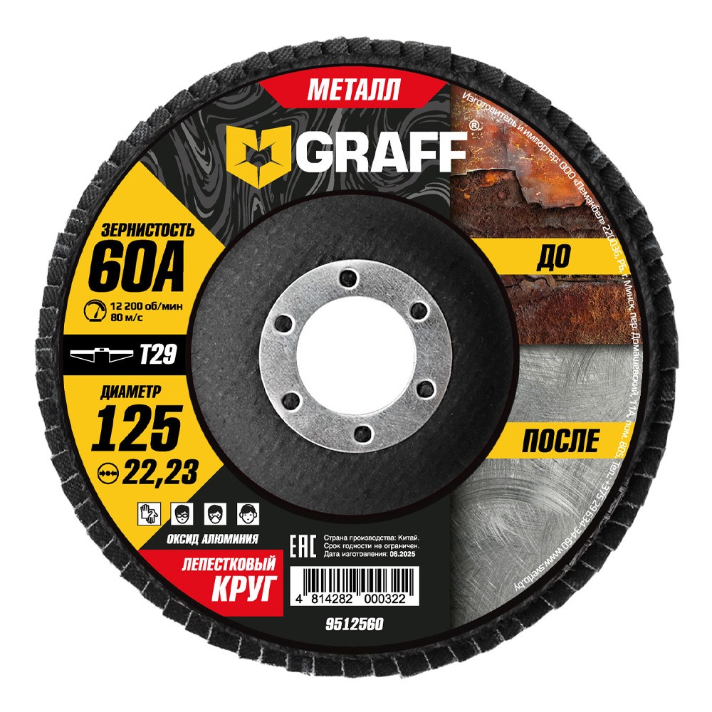 Лепестковый шлифовальный конический круг по металлу торцевой для УШМ (болгарки) Graff. Профессиональный шлифовальный конический круг диаметром 125 мм и зерном 60 на бакелитовой связке для шлифования металла, сварных швов, дерева, пластика и других поверхностей при помощи болгарки. Зерно из оксида алюминия идеально подходит для обработки черного металла.