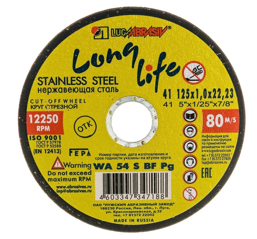 Круг отрезной 125х1.0x22.2 мм по нержавеющей стали LUGAABRASIV
