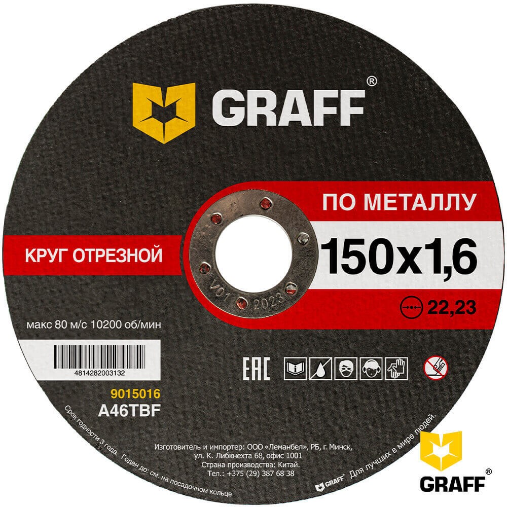 Мощный отрезной круг по металлу 150x1.6 мм GRAFF для болгарки - специально разработан для тяжелых рабочих условий. Профессиональная линейка отрезных дисков по металлу - двойная сетка из стекловолокна и мощное надежно закрепленное центральное кольцо, исключающее вырыв круга из инструмента, а также невысокая цена, позволяющая купить отрезной диск каждому. Оптимально подобранная структура зерна на бакелитовой связке именно для резки черного металла - A36TBF. 150x1.6x22,23 мм - круг предназначен для болгарки (УШМ) с максимальным числом оборотов 10200 об/мин, или 80 м/с.