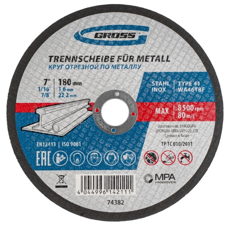 Круг отрезной 180x1.6х22,2 мм по металлу и нержавеющей стали Gross