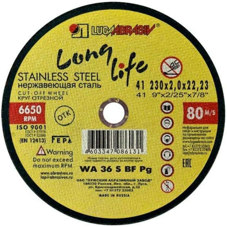 Круг отрезной 230х1.8x22.2 мм по нержавеющей стали LUGAABRASIV