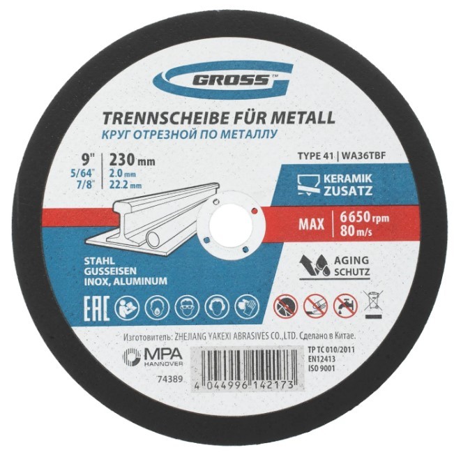 Круг отрезной 230x2.0х22,2 мм по металлу и нержавеющей стали Gross