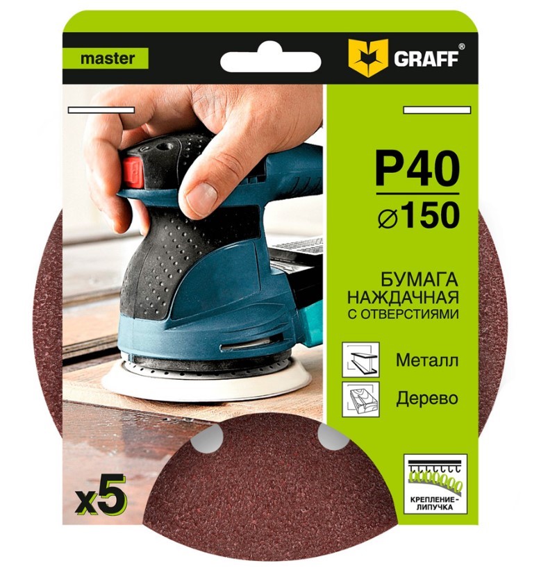 Круг шлифовальный 150 мм P40 отверстий GRAFF - крупнозернистый, предназначен для грубой и черновой обработки материалов и поверхностей. Круг шлифовальный имеет отверстия для эффективного отведения пыли с обрабатываемой поверхности.