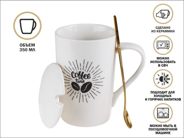 Кружка керамическая с крышкой и ложкой, 350 мл., COFFEE TIME, PERFECTO LINEA