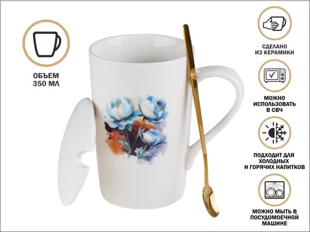 Кружка керамическая с крышкой и ложкой, 350 мл., PEONY, PERFECTO LINEA