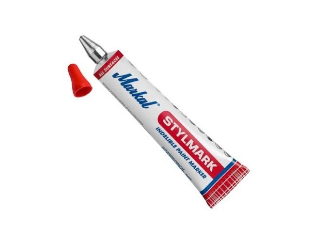 Маркер с металлическим шариковым наконечником Markal Stylmark предназначен для нанесения отметок практически на любые поверхности. Алюминиевый тюбик содержит краску густой консистенции, позволяющую маркировать шероховатые, вертикальные и потолочные поверхности, и