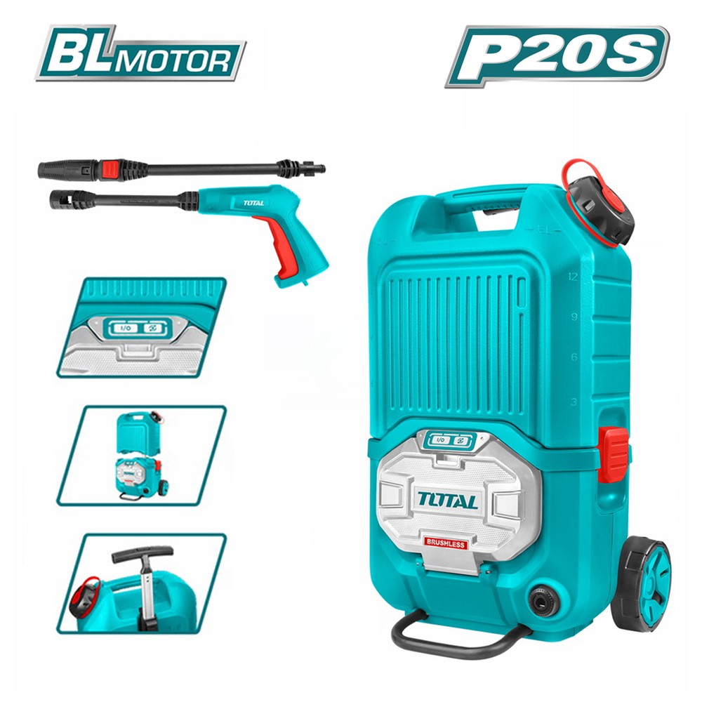- Профессиональная мобильная мойка высокого давления на аккумуляторах TOTAL TPWLI4006 – лучшее решение для очистительных работ, при отсутствии розетки.