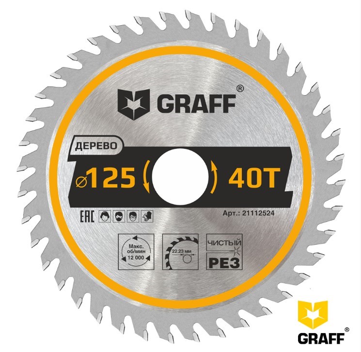 Пильный диск по дереву для УШМ (болгарки) 125х1,2/2х22,23/20/16х40Т GRAFF предназначен для чистого реза, поперечного или продольного распила древесины, ДСП, фанеры и МДФ. Диск подходит как для станков, так и для ручного электроинструмента.