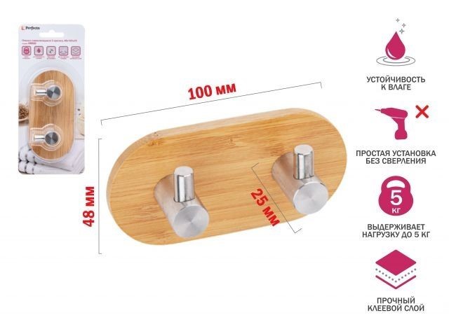 Планка самоклеящаяся 2 крючка VIRGO, нержавеющая сталь/бамбук, блистер, PERFECTO LINEA