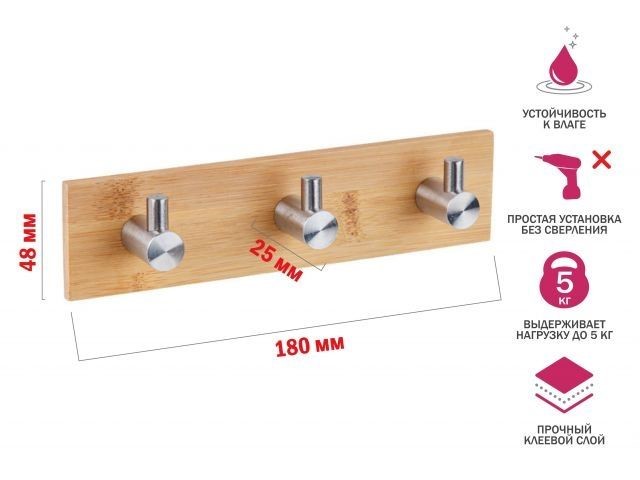 Планка самоклеящаяся 3 крючка PEGASUS, нержавеющая сталь/бамбук, карт.уп., PERFECTO LINEA