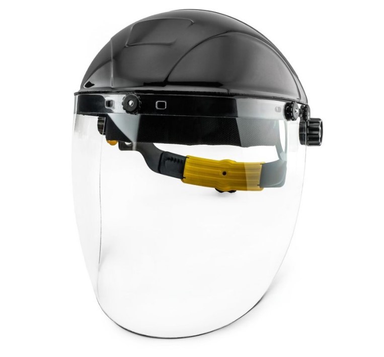 Экран сферической формы с панорамным обзором из ударопрочного и термостойкого поликарбоната со скошенной книзу формой для увеличения эргономики изделия, защита от высокоскоростных летящих частиц с высокоэнергетическим ударом (190 м/с). Козырек увеличенного размера из ударопрочного и термостойкого материала имеет специальную площадку для нанесения логотипа. Наголовное крепление RAPID с мягким обтюратором.