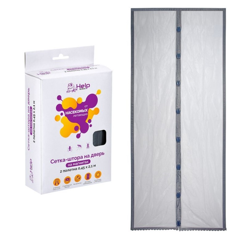 Сетка-шторка 45х210 см, 2 шт. на дверь противомоскитная, с магнитным замком и крепежной лентой, HELP