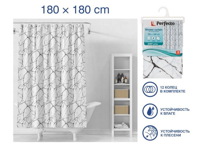 Шторка для ванной (12 колец в комплекте), 180x180 см, Secret, белый мрамор, PERFECTO LINEA