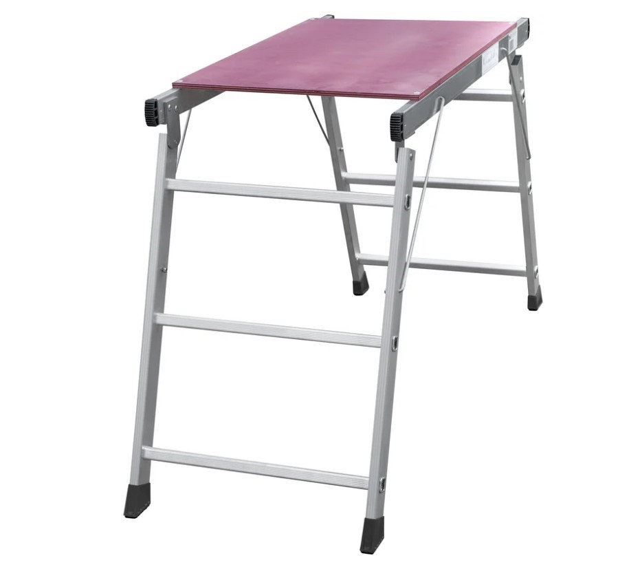 Малярный стол - складные рабочие подмости, изготовленные из алюминиевого профиля, идеально подходит для проведения отделочных и ремонтных работ. Легко устанавливается и складывается в компактное положение для хранения и транспортировки. Ступени с рифлением для безопасного подъема и спуска. Стойки и ступени из прессованного алюминиевого профиля. Многократная развальцовка в соединении ступеней со стойками для высокой прочности и долговечности. Надёжно закреплённые на стойках пластиковые наконечники из двухкомпонентного пластика препятствуют скольжению.
