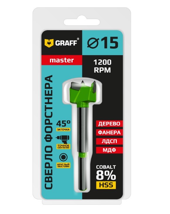 Усиленное сверло Форстнера изготовлено из углеродистой конструкционной нелегированной стали 45 с индустриальными режущими напайками из вольфрам-кобальтового твердого сплава YG8 c содержанием кобальта 8%, подходит для тяжелых работ в древесине любого вида.