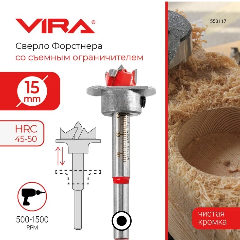 Сверло Форстнера с ограничителем 15 мм, длина 79 мм, VIRA