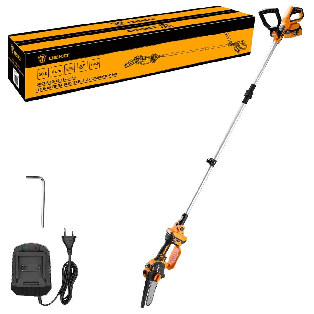 - Цепная пила-высоторез аккумуляторная DEKO DKCHS 20-150, 20В, 1x4.0Ач предназначена для обрезки деревьев и кустов на большой высоте стоящим на земле оператором.